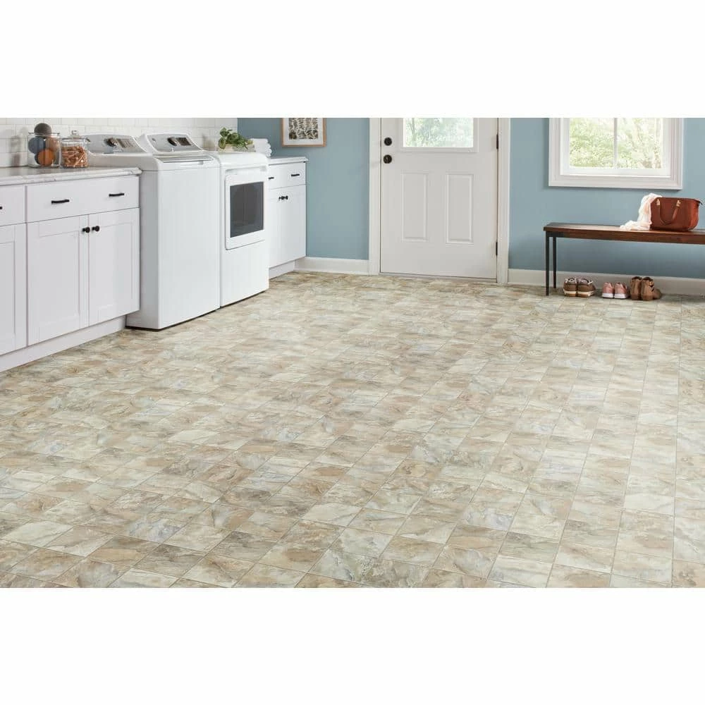 A small-scale slate design in multi-colored neutral tones, the beautiful Neutral Square Slate Vinyl Sheet from TrafficMASTER perfectly complements any decor. Featuring a thick, cushioned backing that provides exceptional comfort and also reduces sound, this flooring is easy to install and even easier to clean. A urethane wear layer provides the toughest protection against common household accidents, ensuring long-lasting appearance and functionality.